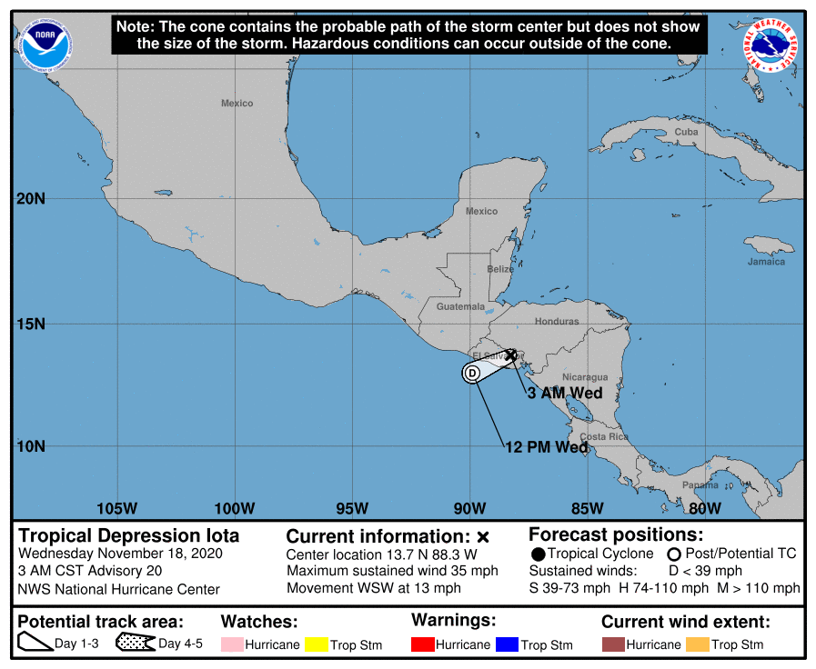 A las 9 am, el centro de Iota estaba a unas 20 millas al oeste-noroeste de San Salvador, El Salvador, y se movía hacia el oeste a 12 mph. Tenía vientos de 30 mph.